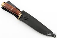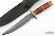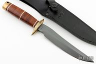 This SBR-80 Recon Bowie has a black coated stainless steel clip point blade with full tang and brass double guard. Blade width is 1/4", depth 1-3/16". Handle is stacked leather with white spacers, brass double guard, and brass butt cap with lanyard hole. Comes with black lether sheath with button closure and belt loop. Patina on brass, but otherwise excellent condition.