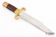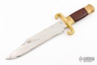 This bowie by John Nelson Cooper features a satin finished clip point blade with false top edge, .216" blade stock and 1.975" blade depth, hidden tang construction. The handle has a brass guard, butt with natural linen micarta grip. Has scuffs, scratches, patina, and has been resharpened. Good condition otherwise.