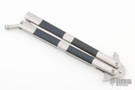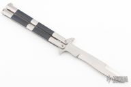 This Mamba by 29 Knives features a satin finished recurve blade with a sharpened top edge. The handles are 303 stainless steel with dovetailed carbon fiber inserts, t-latch at the butt, channel construction. Comes with bill's knife case. Excellent condition.