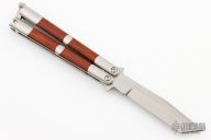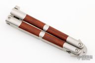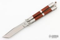 This balisong by 29 Knives features a satin finished tanto blade. The handle is composed of satin finished integral stainless steel with wood inserts. Comes with a zippered case and original box and papers. Has a couple scratches, latch shows a little wear, otherwise excellent condition.