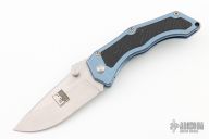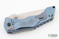 This folder by Jim Burke features a tumble finish blade with notched thumbrest and dual thumbstuds. The handle has an anodized titanium frame with black G-10 inlays, tip down anodized titanium clip, titanium notched backspacer. Has some light scuffs and scratches, great condition otherwise.
