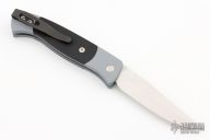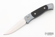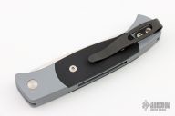 The Walter Brend designed/Pro-Tech collaboration - Small Brend Auto. Has a satin finished blade with false top edge. Special grey handle with black G-10 inlays, tip up stainless steel clip. Comes with original box and papers. PR7 #1582. Has a couple light scuffs, excellent condition otherwise.