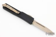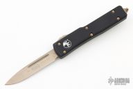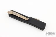 This UTX-70 features a bronze drop point blade. The handle has a black anodized aluminum handle with bronze stainless steel hardware, thumb slide and tip down pocket clip. 10/2018 S/N 1265. Comes with original box. Has a couple light scuffs, great condition otherwise.