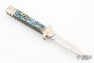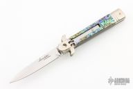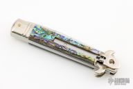 This Leverletto Lever Lock Auto has a mirror polished stainless steel spear point blade. The handle has abalone scales, fluted nickel silver front and rear bolsters, stainless steel liners and back spacer, and nickel silver lock release button. Comes with original box. Excellent condition.