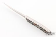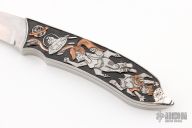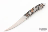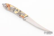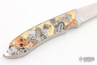 This Art Knife by Ivan Trenchev features a hand rub satin finished blade with .141" blade stock and .698" blade depth, full tang construction. The handle has engraved stainless steel scales with silver and copper inlays with 22k gold foil as the background, it has two small diamonds playing as a comet and a headlight for the flying saucer. "The engraving is on "Futurama" tv show theme, with most characters presented. I know it's not something traditional, but i wanted it to be light and funny/vibrant as a theme." note from the maker. Comes with a presentation box. New from maker!