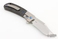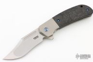These X-Series knives from Enrique Pena/Reate Knives feature two-tone finished, S35VN blades with stonewashed grinds and satin finished flats. The bolsters/liners feature a fine bead blasted finish with marble carbon fiber scales and blue anodized hardware. Blade is centered when closed, flips well with no wrist action needed, and locks up with no blade play. Has some scuffs, otherwise excellent condition. Comes with zippered case.
