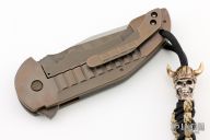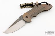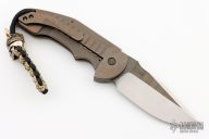 This Custom Crossfire framelock flipper by David Mosier features acid etched flats and satin bevel finish blade with false top edge, notched thumbrest and flipper. The handle has an anodized and milled titanium frame with matching tip up clip, G10 backspacer. Smooth flip action, strong lockup, nice blade seating and detent. Excellent condition. Comes with a zippered case and a brass and silver bead by "GD".
