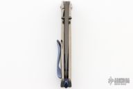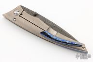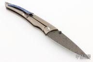 This Chisel by Jeremy Marsh features a Damascus blade with dual zirconium thumbstuds. The handle features a stonewash finished titanium frame with zircuti backspacer and tip up clip with hidden screws. Dated 12/2017 in the backspacer. Comes with a velcro pouch. Excellent condition. Rides on bearings, nice detent, lockup and blade seating.