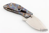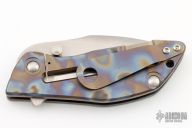 This framelock flipper by Steve Ryan features a satin finish spear point blade with false top edge and dual thumbstuds. The handle has a flamed titanium frame with a matching tip up titanium clip. Nice detent, blade seating and lockup. Excellent condition. Comes with a zippered case.