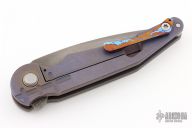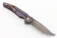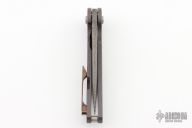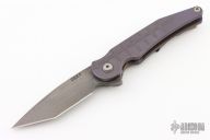 This Prick flipper from DSK Tactical Knives features a Herring Bone Damascus blade. The handle is constructed of titanium that has a stonewashed and anodized finish. The pocket clip is mokuti and positioned for tip up carry. Blade is centered when closed, flips well with no wrist action needed, and locks up with no play. Comes in a zippered case with signed certificate of authenticity. Excellent condition.