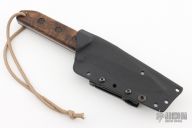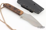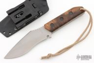 This D-AL by Duane Dwyer features a bead blasted blade with false top edge and notched thumbrest, .190" blade stock and 1.470" blade depth, full tang with wood scales. Comes with kydex sheath with TekLok. Excellent condition.