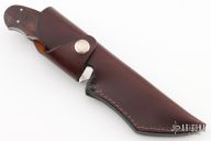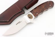 This Integral Hunter by Schrade is a D'Alton Holder design, it features a mirror polished blade with .200" blade stock and 1.179" blade depth, integral full tapered tang construction. The handle has integral dovetailed bolsters with inlaid bear engraving, desert ironwood burl scales with stainless steel pins.  #069. Comes with the original brown leather sheath.  Excellent condition.