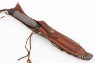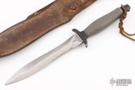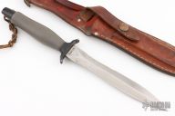 The Mark II is one of the best selling knives of all time. First introduced in 1966, this tactical knife is serialized for collectors. This one has a satin finished double edged partially serrated blade, .203" blade stock and .955" blade depth, hidden tang construction with a black/grey aluminum handle. This knife is Serial #043068 and was made in 1975. Comes with original brown leather sheath. Has some scuffs and scratches, has been resharpened, otherwise good condition for its age.