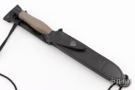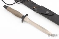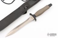 This Mark II by Gerber Knives is the 70th Anniversary Commemorative edition, it features a double edged satin finished wasp waisted blade with .229" blade stock and 1.102" blade depth, hidden tang construction. the handle has a black/grey aluminum handle. Comes with a black leather sheath. Excellent condition.