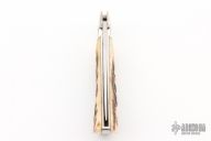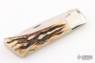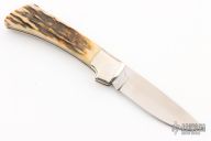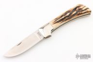 This folding lockback from Jimmy Lile features a satin finish drop point blade with nail nick. The handle has a nickel silver frame with integral dovetailed bolster and liners, stag scales and stainless steel backspacer. Comes with zippered case. Excellent Condition.