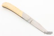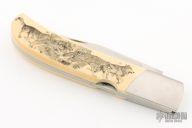 This Lockback by Robert Merz features a hand rub satin finished blade with nail nick. The handle has dovetailed stainless steel bolsters and liners, mammoth ivory scales, stainless steel backspacer. The handle has been scrimshawed by Debbi Rucker. Has a couple very light scratches, otherwise excellent condition.