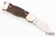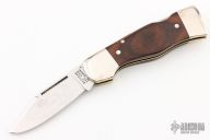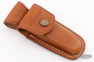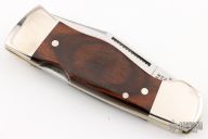 This lockback by Western Cutlery features a polished blade with nail nick. the handle has nickel silver bolsters, wood scales, brass liners and a steel spring. Comes with a brown leather sheath. Has a couple of light scratches, otherwise excellent condition.