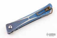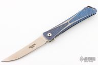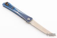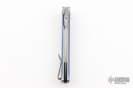 This midtech Bones flipper by Jeff Park features a satin finished blade with notched thumbrest and flipper. The handle has a milled/anodized titanium frame with bead blasted and anodized tip-up titanium clip and anodized titanium backspacer with lanyard hole. Nice crisp detent, solid lockup. Comes with zippered case. Excellent Condition.