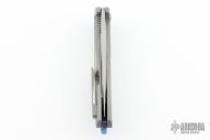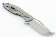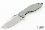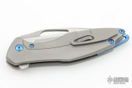 This Arius Flipper by Koenig knives features a burnished with PF blade with thumbhole and flipper. The handle has a bead blasted titanium frame anodized titanium backspacer and a bead blasted tip up clip with hidden screws. Has ceramic bearings and a ceramic detent ball. Nice detent, lockup and blade seating. GEN4. Includes the original box and papers.  Excellent Condition.