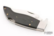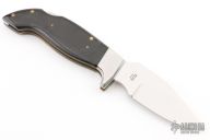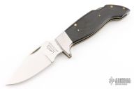 This Pro Hawk by Lakota features a mirror polished blade with nail nick. The handle has stainless steel bolsters, black paper micarta scales, brass liners and a stainless steel backspacer. Comes with black leather sheath. Excellent condition.