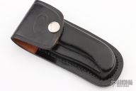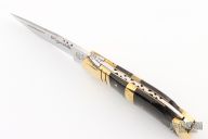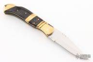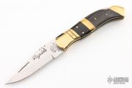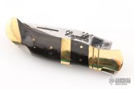 This knife by Laguiole features a mirror polished clip point blade with a nail nick and fileworked spine.  The handle features brass bolsters/liners over a fileworked steel backspring and buffalo horn covers. Has some light scratches, otherwise excellent condition.  Comes with original black leather sheath.