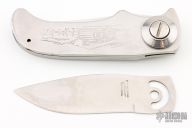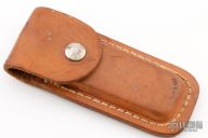 This Swing Lock by Parker Cutlery Company features a satin finished blade with a stainless steel handle. The handle seperates at the butt and swings around to open the knife. Has some scratches, otherwise good condition. Comes with a brown leather sheath that holds an additional blade.