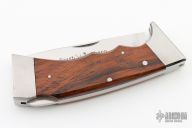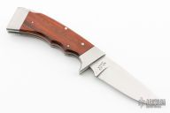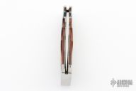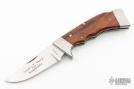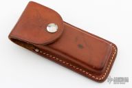 This lockback by Rhino features a mirror polished blade with nail nick. The handle has stainless steel bolsters, wood scales and stainless steel liners and backspacer. Comes with a brown leather sheath. Has a few light scratches, otherwise excellent condition.