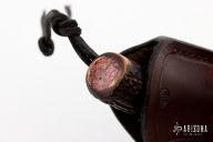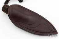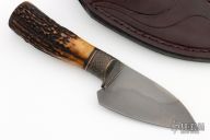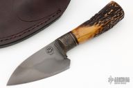 This EDC Knife by Mariano Yannoni features a 1095 blade with nice hamon, .135" blade stock and 1.36" blade depth, hidden tang consruction. The handle has a textured brass guard and a sambar stag grip, copper spacer, and inlaid epoxy on the butt. Comes with a brown leather sheath, COA and leather case. New from maker!