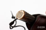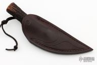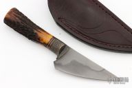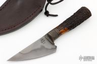 This EDC Knife by Mariano Yannoni features a 1095 blade with nice hamon, .133" blade stock and 1.39" blade depth, hidden tang consruction. The handle has a textured brass guard and a sambar stag grip, copper spacer, and inlaid epoxy on the butt. Comes with a brown leather sheath, COA and leather case. New from maker!