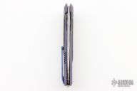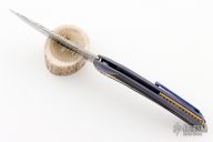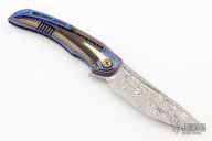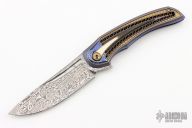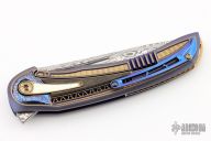 This Aviator by LesBar Knives features a Damasteel blade with notched flipper and fullers. The handle has a milled and anodized titanium frame with anodized titanium, carbon fiber and gold lip pearl inlays, nicely milled and anodized titanium backspacer with lanyard hole, tip up anodized titanium clip with ceramic ball. Has a stainless steel lockface insert. Has a "vented" frame that you can see all the way through. Rides on "In-House Made" ceramic ball bearings and has "In-House Made" screws and pivot. Nice detent, lockup and blade seating. Comes with original box and COA #22 of 33. New from maker!