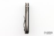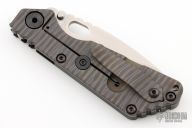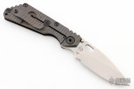This SNG framelock folder by Mick Strider features a stonewashed blade and a dimple pattern black G-10 and flamed titanium frame and tip up titanium clip. Includes a "Lock Bar Stabilizer" for maximum reverse lock retention. Nice detent, lockup and blade seating. New condition.