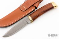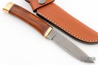 Hattori SAN-77 Limited Cowry-X Damascus Special Utility Hunter is made of Hattori's exclusive Cowry-X Damascus, Cowry-X powdered tool steel core forge layered Nickel and Stainless Damascus steel, 4" Utility blade, 4" Hand rounded Desert Ironwood handle with solid Brass Hilt and Buttcap, Hidden tang, Comes with Brown leather sheath, and Gift box with "Sanjyu 80 year anniversary message and gold label.