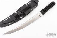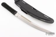 The Hisshou from CRKT features an upswept two tone blade with polished flats and hand rub satin grinds. The handle is comprised of Japanese style wrap over black leather and hidden tang construction. Includes kydex sheath with belt loop. Excellent condition.