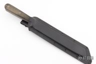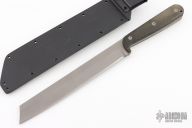 This knife by Entrek Knives features a bead blasted blade with .254" blade stock and 1.218" blade depth, full tang construction. The handle black canvas micarta scales. Lanyard tube in pommel. Includes kydex sheath with belt loop. Excellent condition.