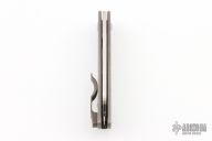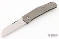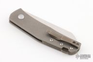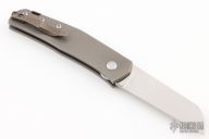 This classy little knife from Jens Anso features a hand rub satin finished wharncliffe blade with nail nick. The handle has a stonewashed titanium frame, anodized and tumbled titanium tip up clip and backspacer with lanyard hole. Has a double detent mechanism to hold but not "lock" the blade in place. Has a half stop. Perfect blade seating. Knife is in excellent condition.
