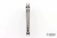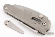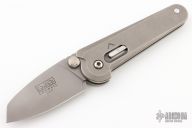 This unique design from Joe Caswell features a tumble finished blade with notched thumbrest and dual thumbstuds. The handle is tumble finished titanium, "50 TNK 02" on back of frame. Has retracting clip when open. Locks via the release bar in the center of the handle. Has nice lockup and blade seating. Comes in padded velcro case and pivot tool. Excellent condition.