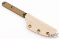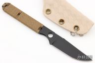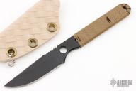 This Riott by Cerberus Knives features a black blade with notched thumbrest, .133" blade stock and .675" blade depth, full tang construction with brown cord wrap. Comes with a kydex neck sheath. Excellent condition.