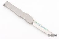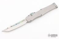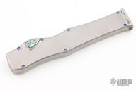 This Marfione custom Halo VI has a mirror polished tanto blade with abalone inlays. The handle is made from double vapor blasted stainless steel with blue titanium hardware, and has no integrated safety on the push button, push button has abalone inlay. The charging handle comes marked with the Marfione Dagger and dated 03/2020. Has abalone inlay in the charging handle and button. Comes with original box, zippered case and COA. Excellent condition. Microtech's Halo VI sets itself apart from previous models with added features and an improved charging handle mechanism. Its upgraded charging handle is built with dual pivoting latches that create a secure seal in the closed position. Dated 03/2020 and s/n 002.
