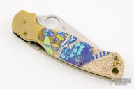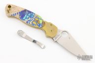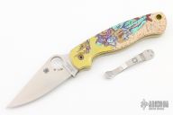 This Paramilitary 2 Linerlock Folder from Spyderco has a satin finished clip point blade with thumb hole and notched thumb rest. Handle has custom Flytanium scales with stainless steel liners and stainless steel 4-way reversible clip. Excellent condition. Comes with original box and papers and clip.