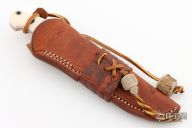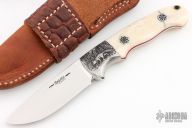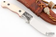 This hunter by Bernard Sparks features a mirror polished drop point blade, .160" blade stock and .990" blade depth, full tapered tang construction. The handle has engraved steel bolsters, walrus ivory scales with engraved pins and red liners.  Includes a brown leather sheath. Has a crack in one of the scales, otherwise excellent condition.