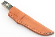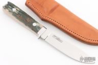 This Green River Skinner by SR Johnson features a mirror finished blade with .183" blade stock and 1.063" blade depth, full tapered tang construction. The handle has a stainless steel guard, mammoth ivory scales with red liners and SS pins. Comes with a brown leather sheath. Excellent condition.