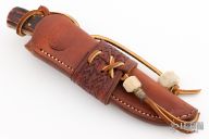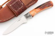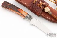 This hunter by Bernard Sparks features a mirror polished drop point blade, .117" blade stock and .725" blade depth, full tapered tang construction. The handle has engraved steel bolsters, stag scales with nickel silver pins and red liners.  Includes a brown leather sheath. Excellent condition.