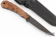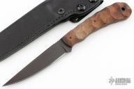 This knife is a collaboration between Daniel Winkler and Kevin Holland, US Navy SEAL (ret.) and US Army Special Operations (ret.). Kevin’s expertise as a military operator, as well as a skilled trapper/outdoorsman, resulted in a knife that is not only effective in tactical environments, but provided utility when required. Knife Specifications Blade steel: 80CrV2 Black oxide no-glare finish Blade length: 4 1/8" Overall length: 9" Blade thickness: 5/32" Full tapered tang Thumb index file work Sheath Black leather. Comes with original packaging. Excellent condition.
