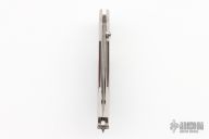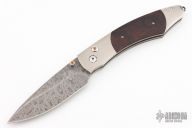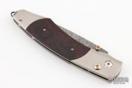 This folder features a titanium frame with ironwood scales. Citrine inlays in thumb stud and push button. The push button releases the lock and allows you to close the knife. The drop point blade is composed of Damascus. Includes the original box and leather sheath. Light scratches are visible on the blade, has been resharpened, otherwise the knife is in good condition.