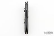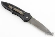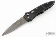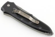 This Cobra side-opening automatic by Paragon Cutlery features a black blade with swedge. Coil spring. Sliding safety. Black aluminum handle with rubber inserts, tip down black stainless steel clip. Excellent condition.