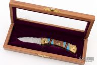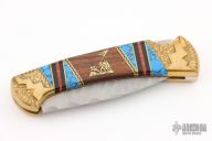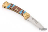 This Buck Model 112 knife Customized by David Yellowhorse is a lock back with brass bolsters, ironwood, turquoise, jasper and brass spacers. Satin finished blade. Strong lock up. Comes with display box and original packaging. Excellent condition.