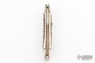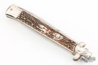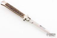 This swivel bolster auto by Latama features a bayonet blade with a false top edge. Nickle silver bolsters and stag scales with brass liners. Nice function, strong firing and lock up. Excellent condition.