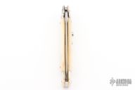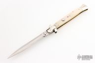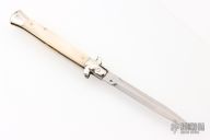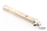 This swivel bolster auto by Latama features a bayonet blade with a false top edge. Nickle silver bolsters and white bone scales with brass liners. Nice function, strong firing and lock up. Excellent condition.