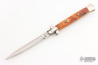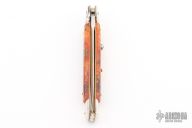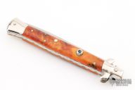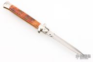 This swivel bolster auto by Latama has been customized by TBark Knives. It features a dagger blade with a false top edge. The handle has nickle silver bolsters, pinecone in resin scales with orange liners, stainless steel push button with black stone inlay, fileworked brass liners, fileworked stainless steel backspacer. Nice function, strong firing and lock up. Excellent condition.