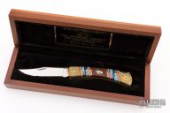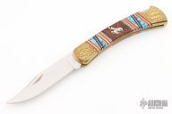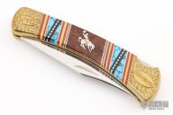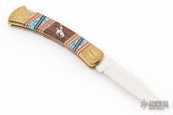 This Buck Model 110 knife Customized by David Yellowhorse is a lock back with a brass frame, wood and stone inserts with nickel silver inlays. Strong lock up. Includes a display box with acrylic stand and COA. Excellent condition. #077/250.